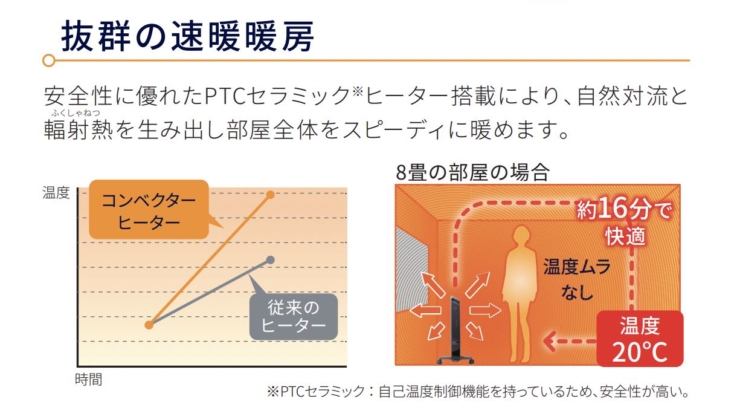 コンベクターヒーターは、8畳の場合最短約16分で部屋が暖まります。