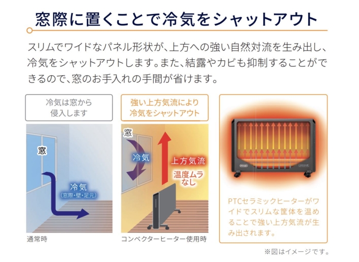 コンベクターヒーターなら、上方への対流を生むため窓際からの冷気をシャットアウトしてくれます!